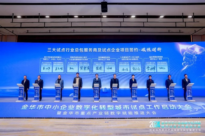 金華金辰作為此次金華市中小企業(yè)數(shù)字化轉(zhuǎn)型城市試點(diǎn)總包服務(wù)商(電動(dòng)工具、磁性材料),倪小紅女士代表參與了此次啟動(dòng)儀式。在啟動(dòng)會(huì)上與磁性材料試點(diǎn)企業(yè)——九禾磁電進(jìn)行項(xiàng)目簽約,率先開(kāi)展數(shù)字化轉(zhuǎn)型實(shí)踐。標(biāo)示著金華金辰在金華政府的支持下,將逐步探索出一條符合本地中小企業(yè)實(shí)際情況的數(shù)字化轉(zhuǎn)型特色之路,為中小企業(yè)數(shù)字化轉(zhuǎn)型提供有效金華經(jīng)驗(yàn)!