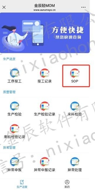 SOP分為兩種:檢驗(yàn)SOP和加工SOP,檢驗(yàn)SOP在來料檢驗(yàn)單跳轉(zhuǎn),加工通過掃描工序計(jì)劃單進(jìn)行查詢;