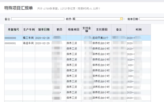 除車間的工序匯報以外,針對辦公室或其他獎勵等機制的工資錄入,通過特殊項目匯報單進行工資匯報,單據中的項目可自定義,及時形成對應的工資表。